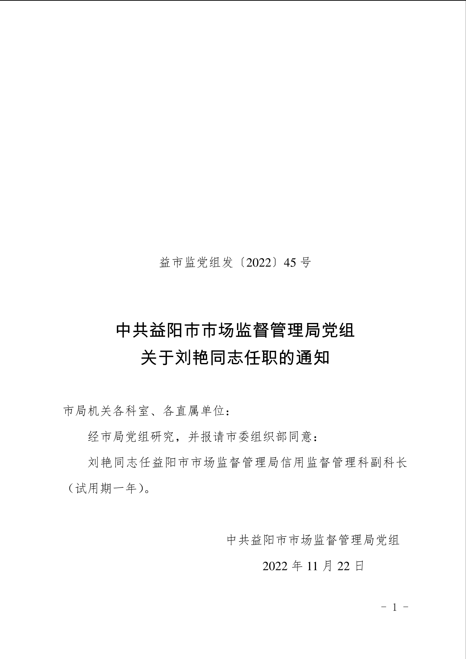 | 关于刘艳同志任职的通知 |
