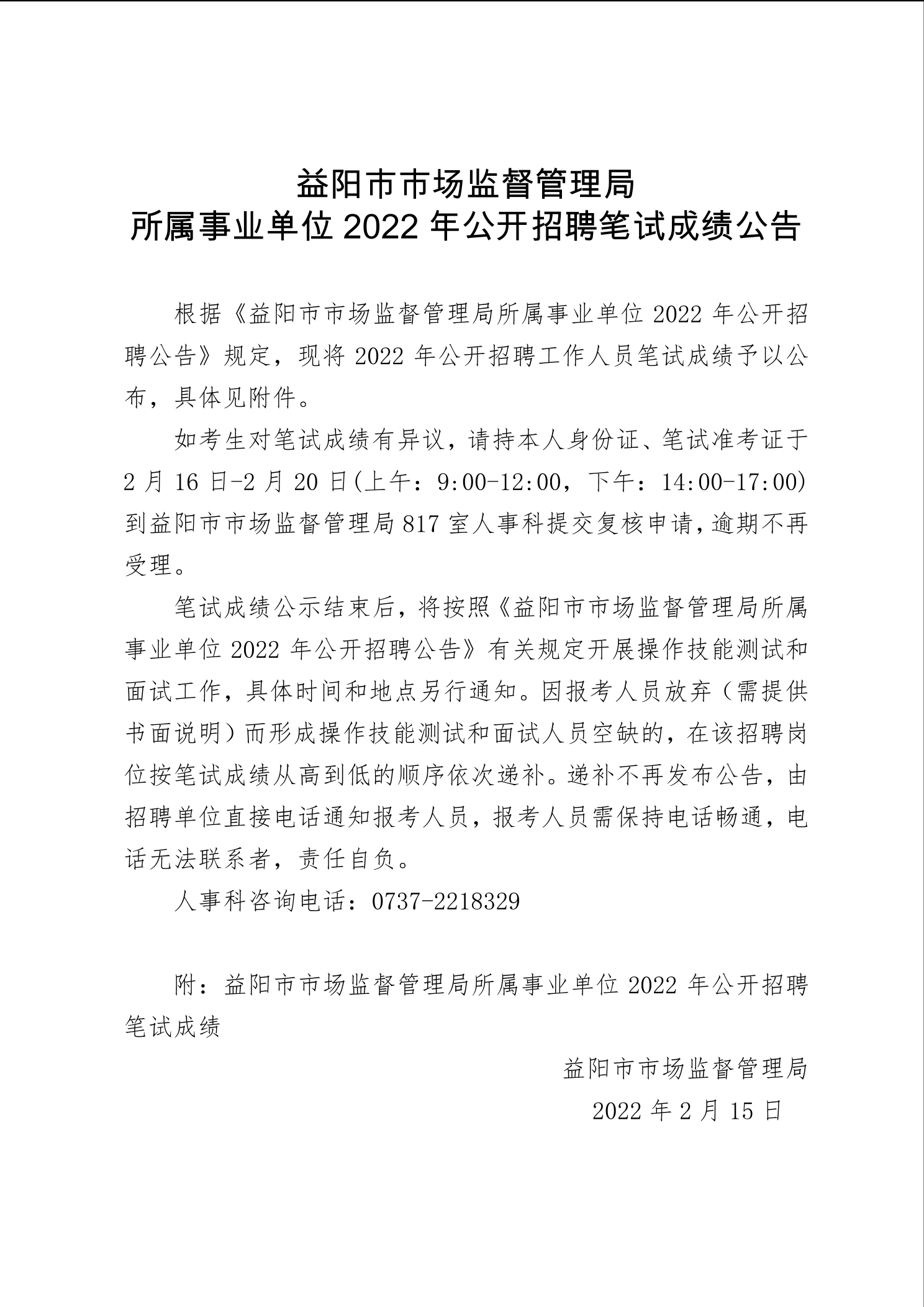 | 益阳市市场监督管理局所属事业单位2022年公开招聘笔试成绩公告 |