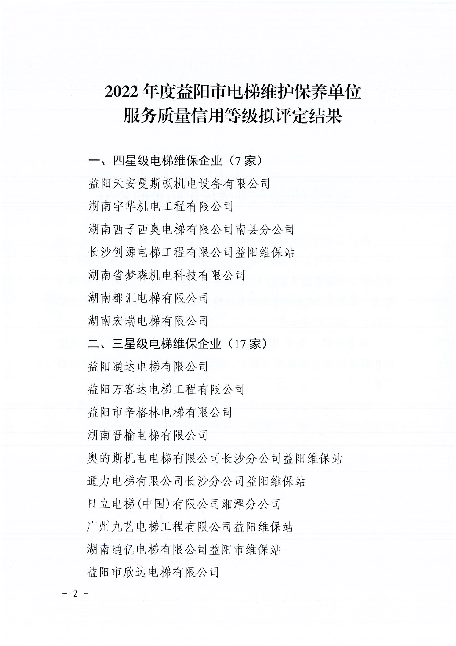 | 关于2022年度益阳市电梯维护保养单位服务质量信用等级评定结果的公示 |