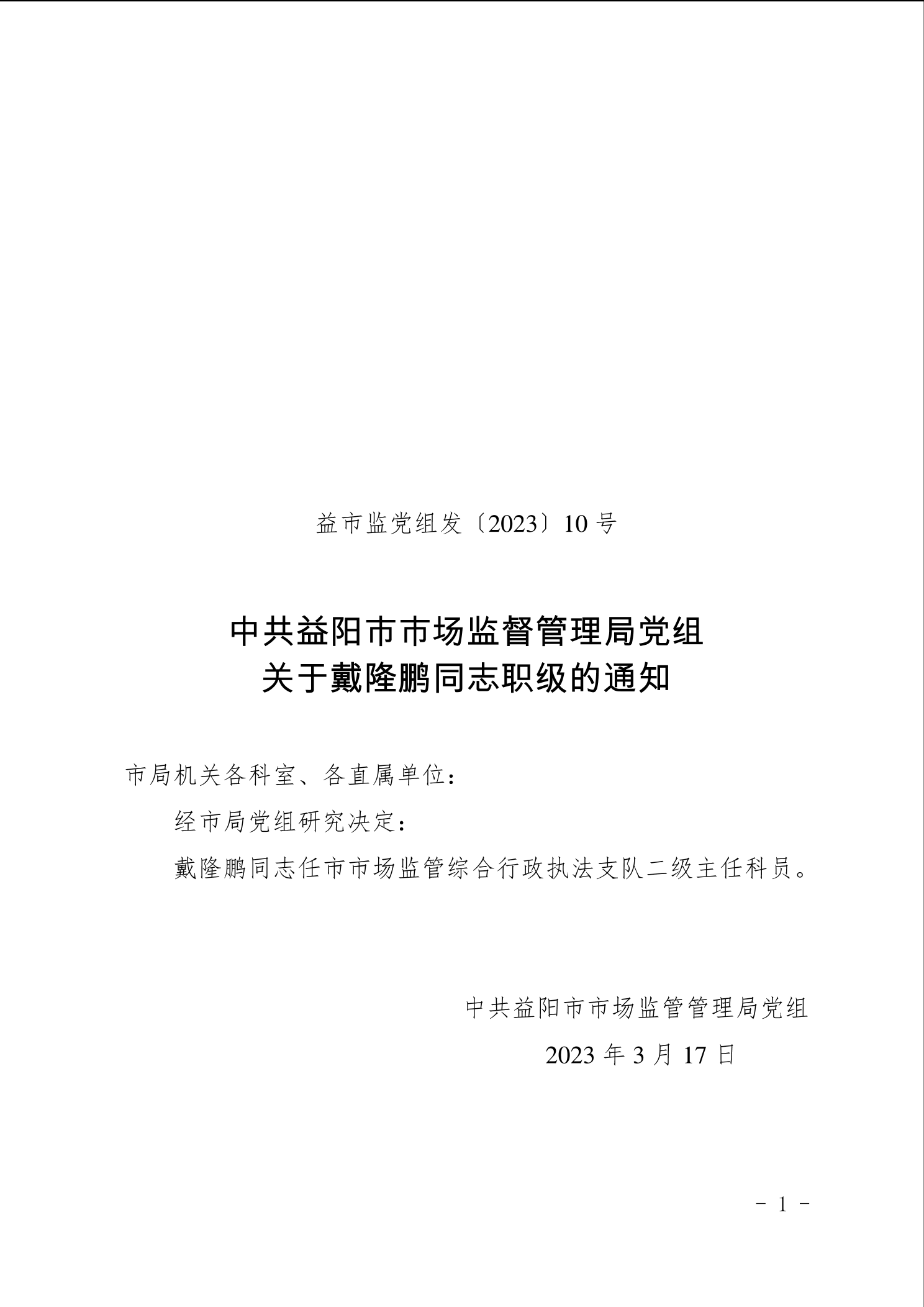 | 中共益阳市市场监督管理局党组关于戴隆鹏同志职级的通知 |