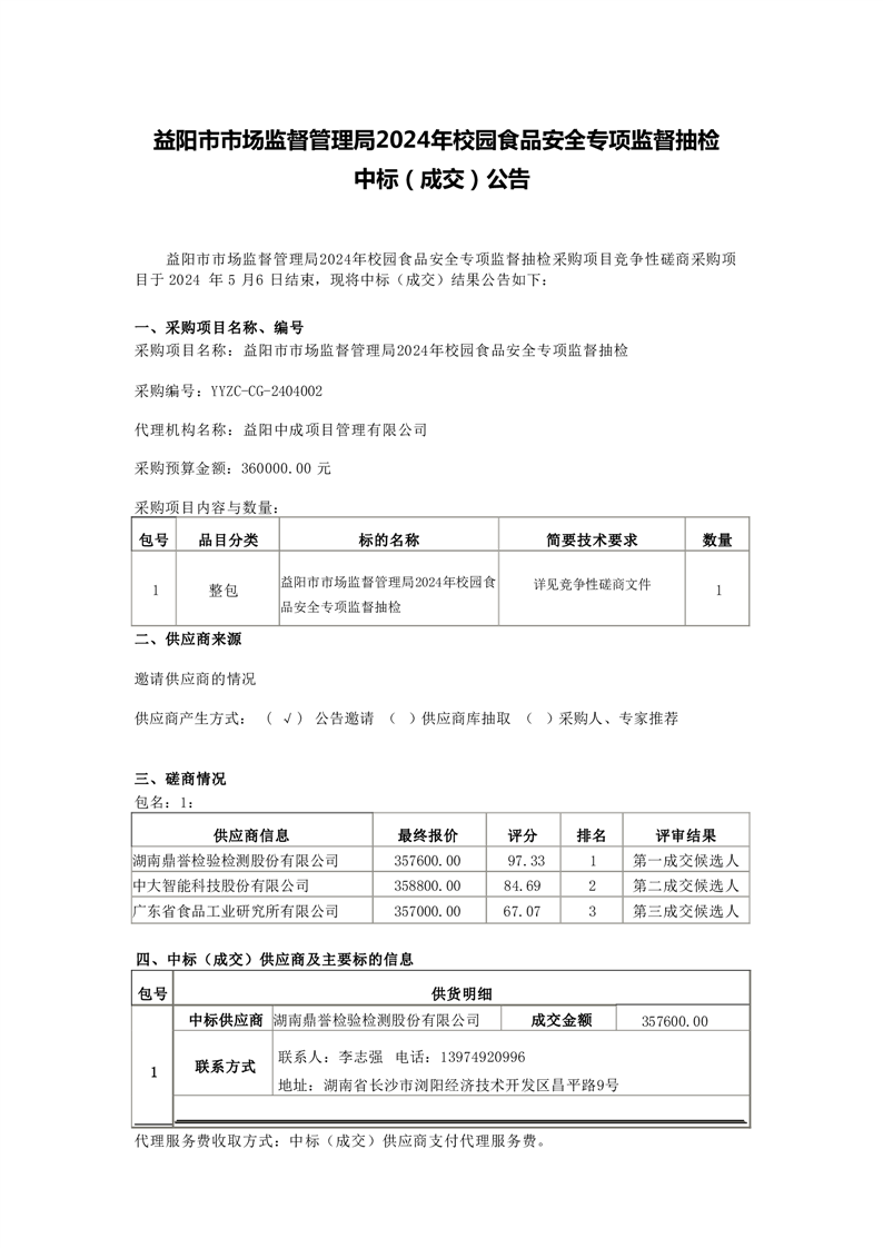 | 2024年校园食品安全专项监督抽检中标(成交)公告 |