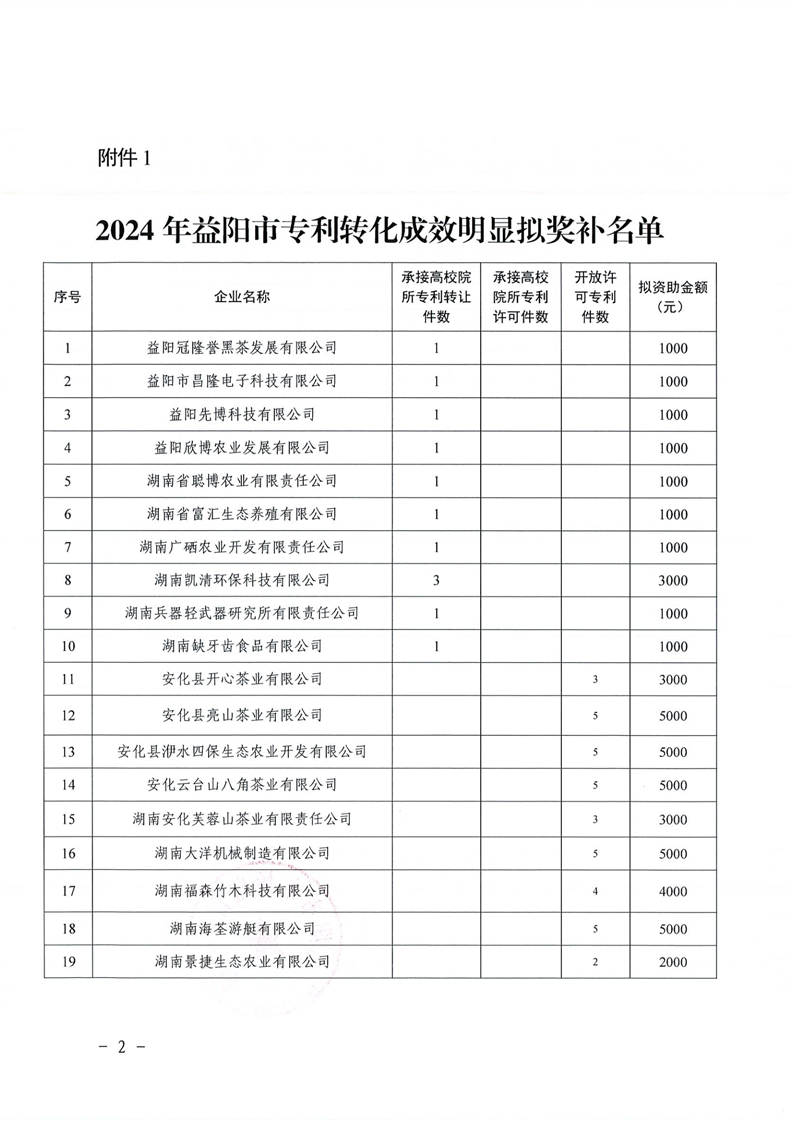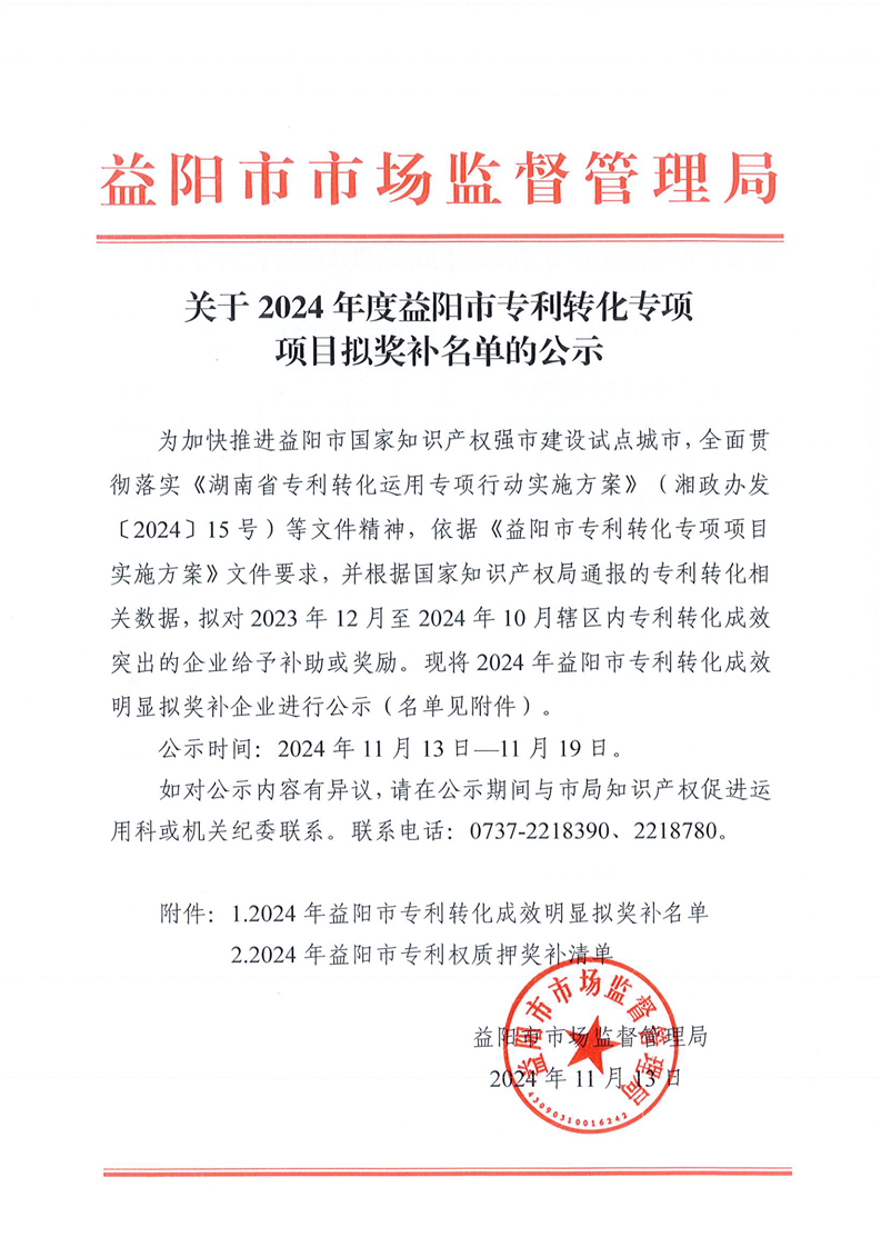 | 关于2024年度益阳市专利转化专项项目拟奖补名单的公示 |