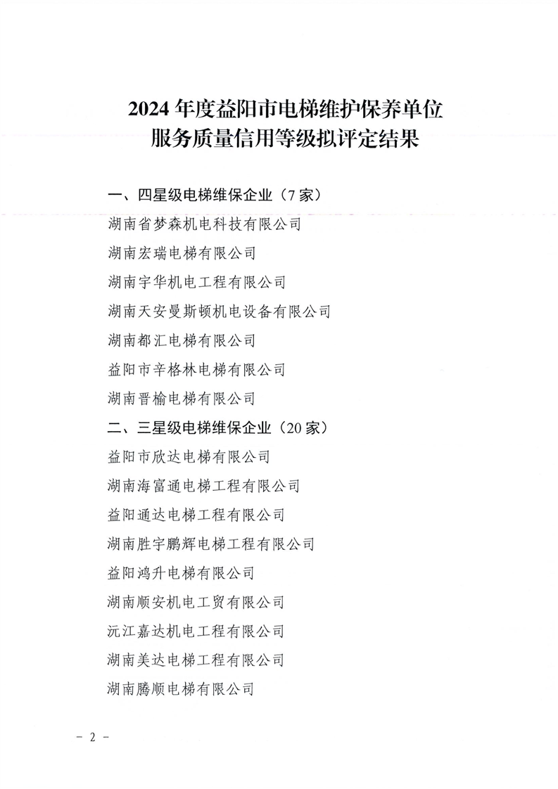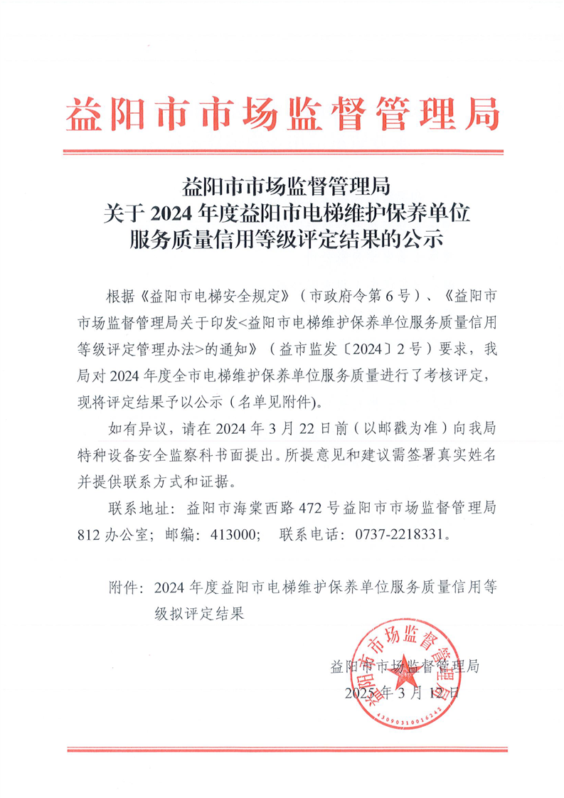 | 关于2024年度益阳市电梯维护保养单位服务质量信用等级评定结果的公示 |
