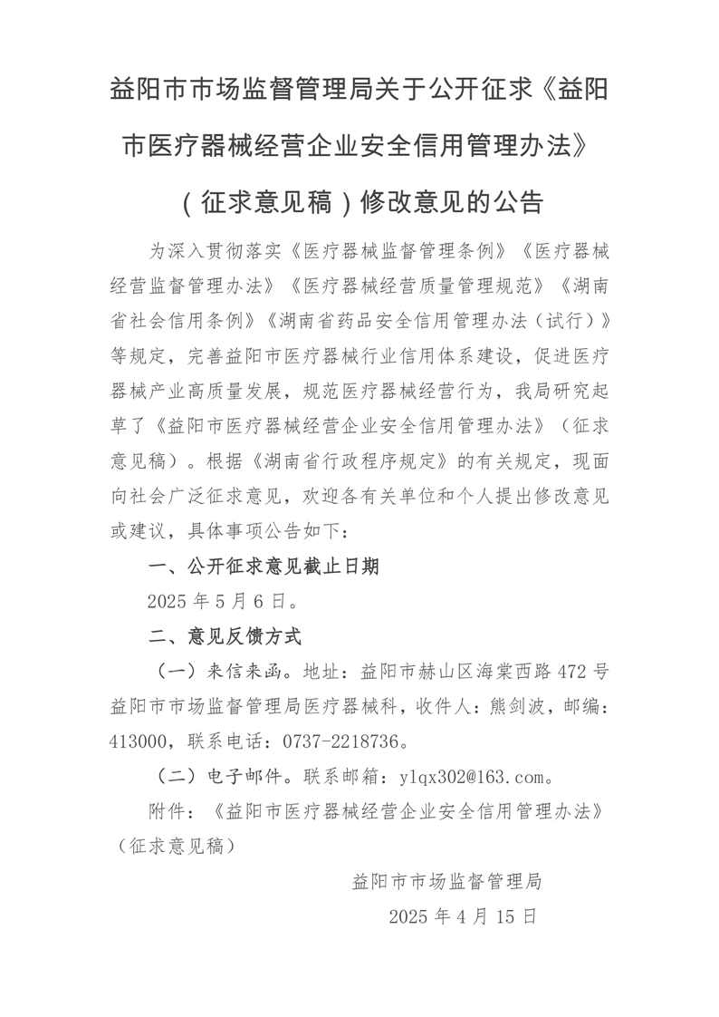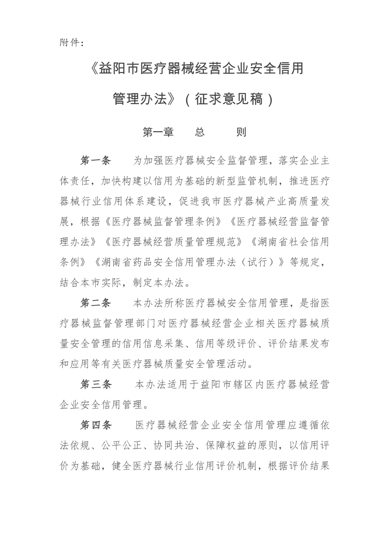 | 关于公开征求《益阳市医疗器械经营企业安全信用管理办法》(征求意见稿)修改意见的公告 |