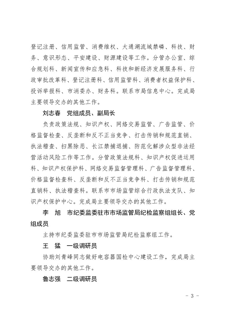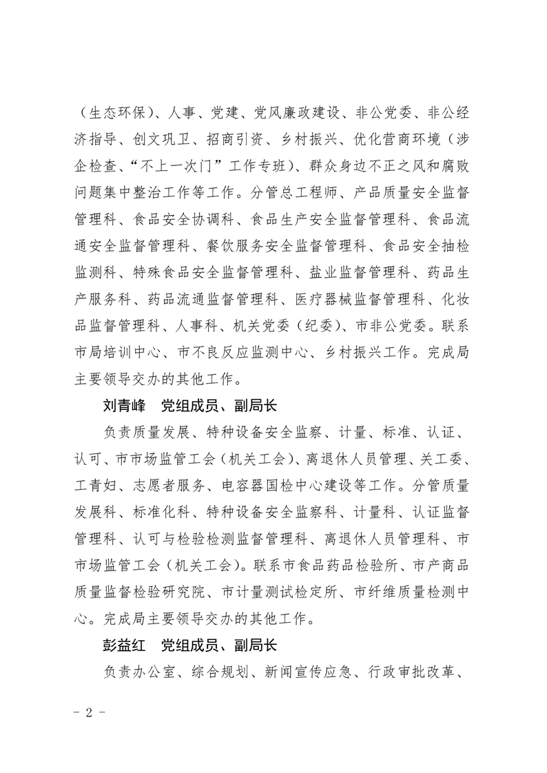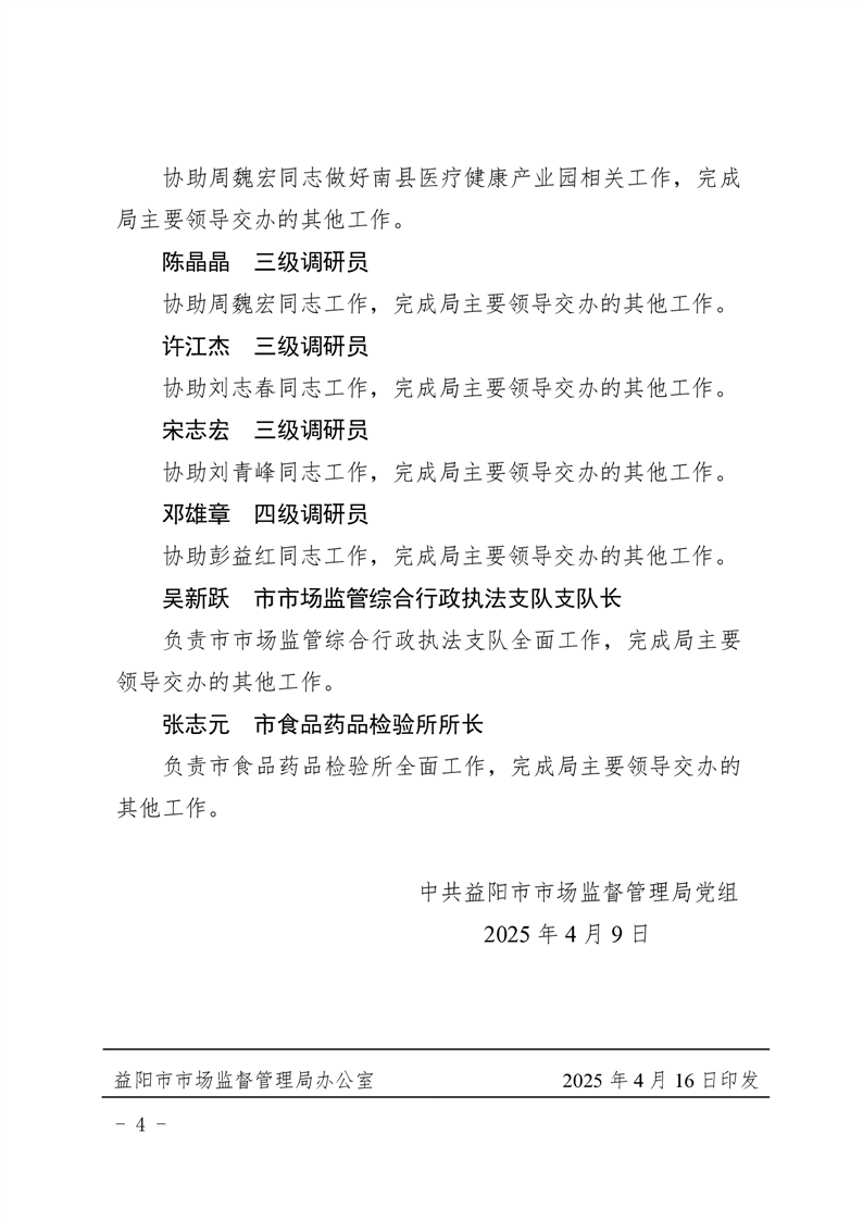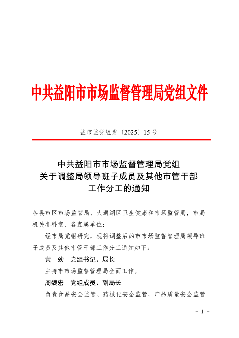 | 关于调整局领导班子成员及其他市管干部工作分工的通知(益市监党组发〔2025〕15号) |
