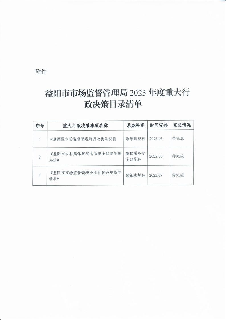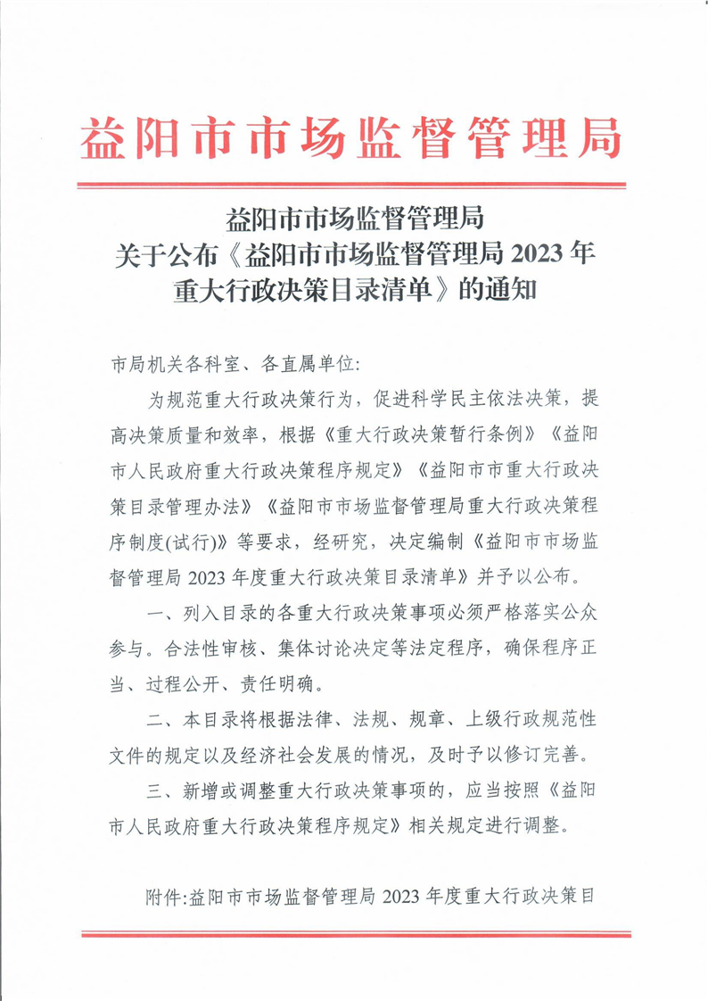 | 关于公布《益阳市市场监督管理局2023年重大行政决策目录清单》的通知 |