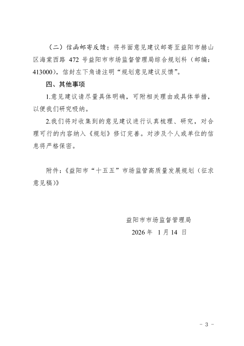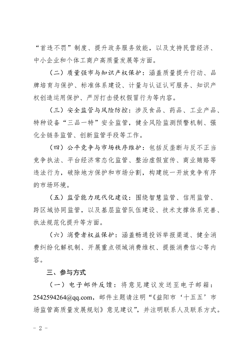 | 关于征求《益阳市“十五五”市场监管高质量发展规划(征求意见稿)》意见建议的通知 |