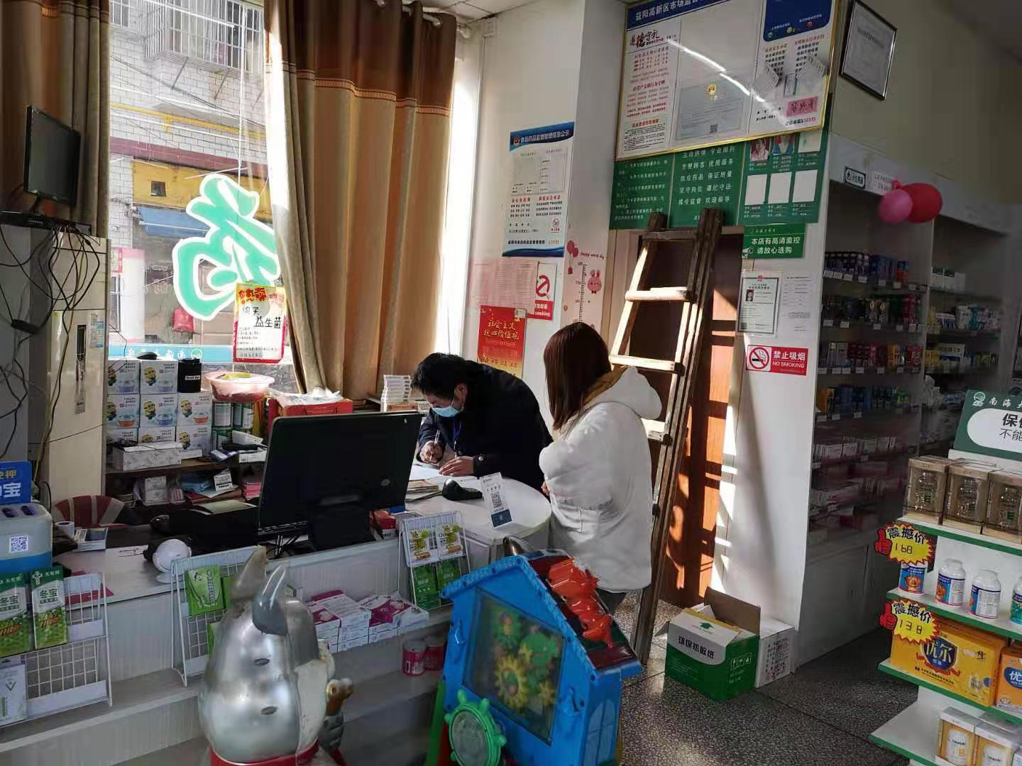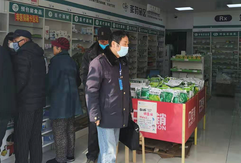 (杨玉夫在药店进行执法检查) 大年初六,老杨巡查了一天的市场,临下班的时候回到办公室倒了杯茶,准备歇一歇再回家洗个热水澡,好好休息一下。“叮铃铃!”手机铃声欢快地响了起来,“我们这个小区有人卖假冒伪劣的口罩,你们快来咯。”接到举报后,老杨立马放下还没来得及喝一口的茶,赶往现场控制了涉案人员,并对涉案口罩进行了扣押。