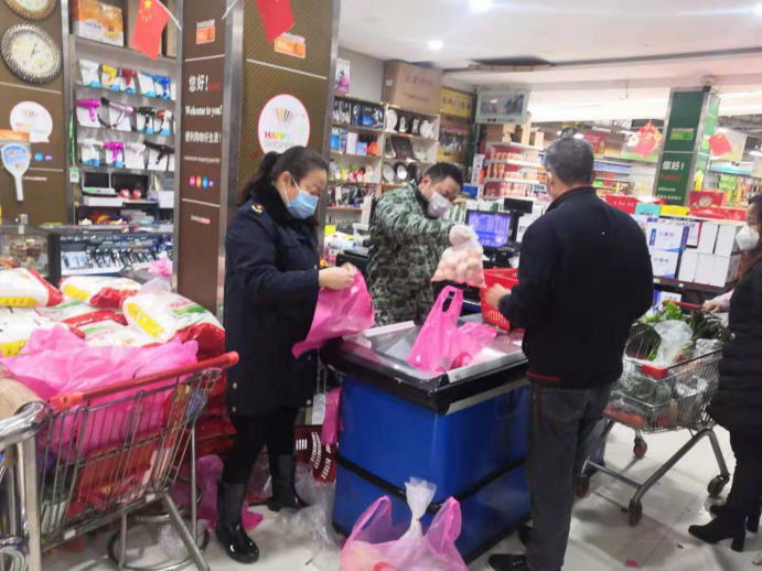 (平口所工作人员给进入超市的群众量体温,所长肖煜协助收银员工作)