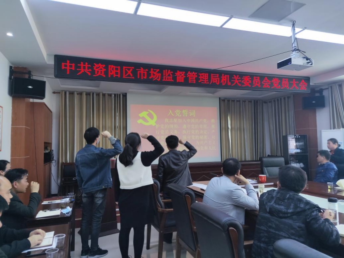 (新党员宣誓) 该局党组书记蒋利敏充分肯定过去一年各党支部取得的工作成绩,同时指出了各支部存在的问题,对加强和改进后段工作提出明确要求。他要求,局党组和基层党支部要进一步落实好党组织主体责任和班子成员“一岗双责”,矢志不渝把加强党的建设放在心上、抓在手上、落实在行动上;全局党员要持续提升政治业务水平,加强党性修养和岗位锤炼,以强烈责任心构筑强大公信力,在讲好资阳故事中讲好资阳市场监管党员干部的新故事、展现新作为。