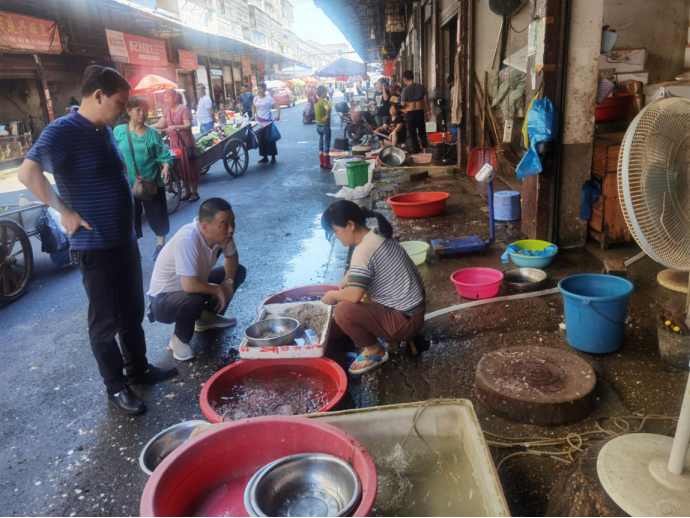 (图为该局局长唐清云检查水产品摊位) 自长江流域禁捕退捕工作开展以来,沅江市市场监管局坚决贯彻落实上级决策部署,严格执行国家市场监管总局“五个禁止”规定,切实开展省局“五大专项行动”,严厉打击市场销售外湖流域非法捕捞渔获物的违法行为,坚决斩断终端销售产业链。 细化监管 答好面广点多难题 沅江江南集贸市场周边以及广通大酒店后“夜宵一条街”历来就存在经营户数量多、治理难度大的问题,为保证不打折扣的完成任务,该局执法人员邱立兵一组四个人从早到晚扎根在责任区域,挨家挨户进行检查,并宣传禁捕退禁工作。三十多度的高温,一天下来,邱立兵等人的衣服都可以拧出水来,但是门店外一块块被清理的招牌,门店内一份份整改的菜单和经营户们一张张满意的笑脸,无疑是对他们工作最大的认可,这也是对所有奔波在一线的执法人员付出的肯定。 今年是“十年禁捕”的第一年,沅江市市场监管局做好充分准备,分清重点、分析难点、严控风险点。通过采取“全局动员、全员出动、各负其责、狠抓落实”等网格化措施,层层压紧压实工作责任,落实落细各项工作任务,确保不留死角。截至目前,该局已对全市4494家餐饮单位、15家鱼类加工企业、47家水产品生鲜超市、18个集贸市场、104家渔具店全部摸排、上门督导到位。
