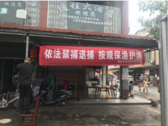 截至8月11日,该局共出动执法人员725余人次,检查农贸市场212余家次、超市305余家次、餐饮单位1378余家次;悬挂横幅100条、张贴标语3000余份、电子显示屏播放标语600余条、签订承诺书1105余份;清理含有“河鱼”、“野生鱼”等字样的门店招牌20块、菜单43份,店堂广告7张;督促55家渔具店或日杂店下架禁售渔具;督促电商平台下架(删除、屏蔽)非法交易信息13条;下达责令整改通知书21份,行政指导意见书3份。