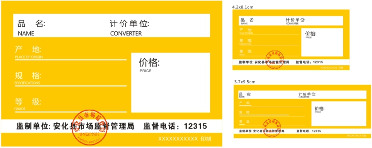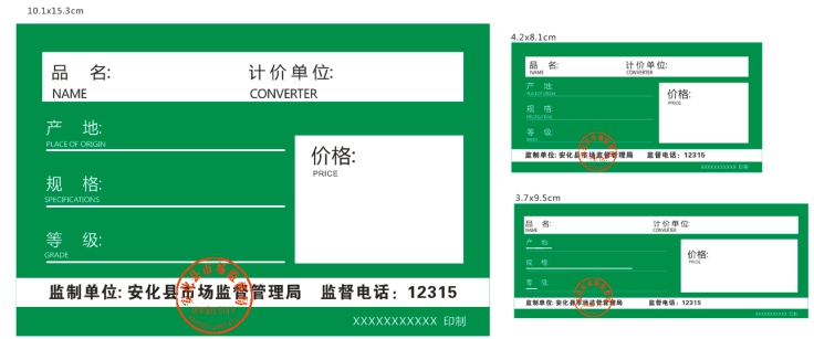 (部分样式) 据了解,新发布的这11种标价签将由该县各经营者根据实际情况印刷使用,对于需要使用自制标价签的商户,其自制标价签需经安化县市场监管局监制备案后方可使用。 此外,该局将不定期开展市场巡查,对经营者涉及明码标价方面的问题进行告诫提醒,现场整改。拒不按规定对商品及服务进行明码标价的,将依法进行查处。同时,消费者如果发现或遇到价格方面的问题、纠纷,请拨打12315投诉举报电话进行举报投诉,安化县市场监管部门将尽职履责,依法维护广大消费者的合法权益。 |