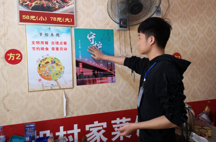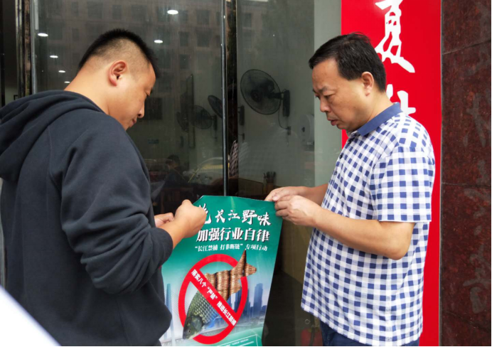 (执法人员将宣传海报张贴在餐饮店内) 会议要求,要提高思想认识,将阶段性思路变成持久性思路;要迅速开展回头看,针对督查通报中存在的问题逐一整改销号;要加强对餐饮从业人员的宣传教育,强化行业自律,自觉拒卖野生鱼类,提升公众保护长江生态环境的意识;要彻查清理违规字样。