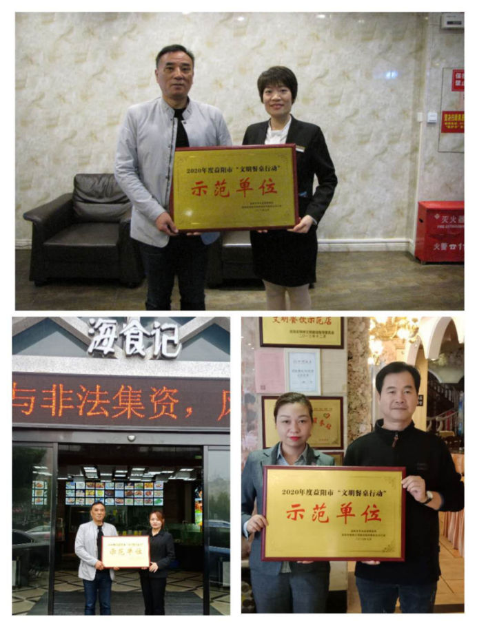 日前,益阳市市场监督管理局、益阳市精神文明建设指导委员会办公室授予中心城区一批餐饮企业为2020年度益阳市“文明餐桌行动示范单位”,资阳区4家餐饮企业榜上有名。受评奖单位委托,益阳市资阳区市场监督管理局上门将荣誉牌匾一一颁授给资阳区海食记酒楼、加洲酒店、华信国际大酒店、阿俊迎宾楼等4家餐饮企业。