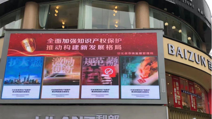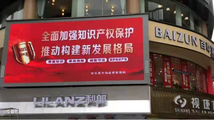 (商场电子屏开展知识产权宣传) 该局深入企业开展地理标志、专利、商标注册使用情况调研;联系移动、联通、电信公司通过短信的形式向广大群体重点宣传知识产权法律法规和基本知识,引导公众严格保护和合理运用知识产权;联系辖区商家、企业以悬挂横幅、微信公众号、电子屏幕滚动播出的形式进行宣传;在安化县沿江路步步高广场开展知识产权大型现场宣传咨询活动,发放知识产权宣传册,组织执法人员解答群众疑问,大力宣传知识产权文化理念。