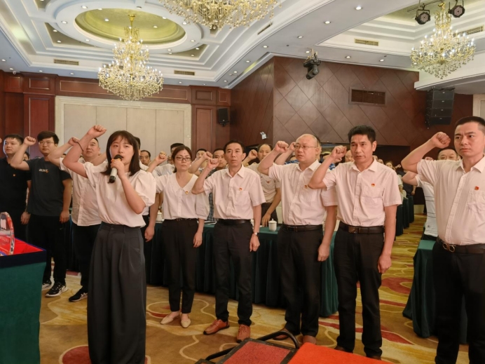 会议在庄严的国歌声中拉开序幕,全体党员举起右拳,重温入党誓词。“我志愿加入中国共产党,拥护党的纲领……”党员们铿锵有力的宣誓声在会场回响。