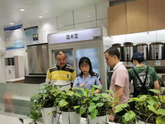 (检查人员在奶茶店检查) 检查人员随机抽查了美团外卖网上订餐平台和暑期学生青睐、消费较大的“益禾堂”奶茶、“德克基”汉堡包两家线下门店,对从业人员健康管理,公开承诺,食品及原材料进货查验,餐饮具清洗消毒,后厨环境卫生,制止餐饮浪费行为一一进行了检查,同时向从业人员宣传了食品安全知识,从源头杜绝安全事故的发生。针对检查中发现的原材料进货查验资料不全,从业人员食品安全培训不够等问题,检查人员当即责令经营者限期整改。 该局负责人表示,下阶段将持续加大对涉及消费者人数较多、社会影响力较大的餐饮服务单位、学校食堂的检查力度,规范食品经营行为,严格管控食品安全风险,不断提高人民群众在餐饮服务领域的获得感、安全感、幸福感。 |
