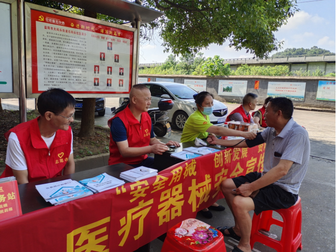 同时,结合党史教育我为群众办实事实践活动,为社区群众测量血压血糖、发放夏日清凉饮品,借此机会积极向群众宣传建党百年医疗器械产业发展成果。