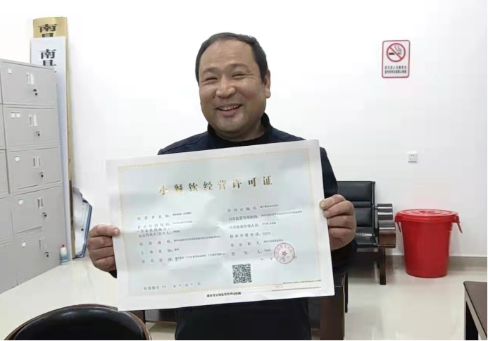 11月1日,在南县经济开发区市场监督管理所,南洲十元快餐店的季先生拿到了自己申请的小餐饮经营许可证,季先生高兴的说:“开始我以为会很麻烦,居然即来即办,这个真是高效利民的好政策,让群众办事省事省力更省心。”