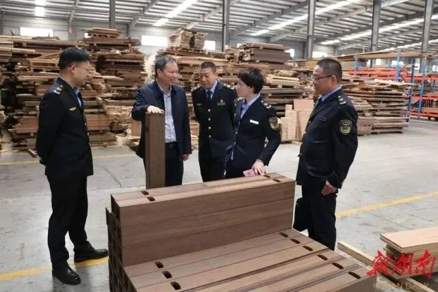 (桃江县市监局工作人员在桃花江竹材科技股份有限公司调研,帮助企业解决难题。范博琳 摄)