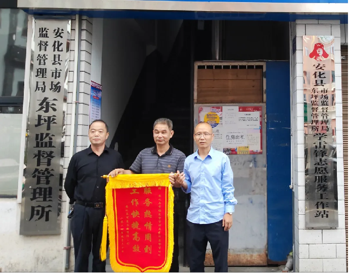 近日,安化县市场监督管理局东坪监督管理所收到安化县可茗茶业有限公司送来的一面“工作快捷高效 服务热情周到”的锦旗,对东坪监督管理所的窗口高效审批与优化营商环境的服务表示感谢。