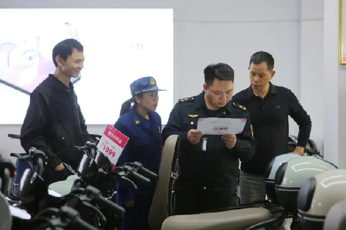 检查组随机抽查县内20家电动自行车销售门店,主要检查商家是否存在销售不符合国家强制性标准、未取得3C认证、未明码标价出售、非法改装电动自行车等违法行为。检查中发现2家电动自行车销售门店存在非法加装座椅的违法行为,工作人员现场责令其改正,督促其落实主体责任,确保产品质量安全。