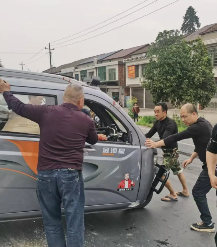 原来,当日上午,桃江县市场监督管理局食品流通股工作人员下乡开展食品安全专项检查时,行至浮邱山水口山加油站路段,突遇一辆三轮车侧翻在地,车主困在车中不断呼救。见此险况,熊栋梁、丁志高等人迅速行动,化身“大力士”展开救援,与过往热心群众合力将侧翻的三轮车扶正,并成功帮助被困女士脱险。在再三确认车主无大碍后,大家一起将三轮车推至道旁以确保来往车辆畅通无阻,这才继续赶往目的地执行检查任务。一次意外考验,一场暖心救援。桃江县市场监管局工作人员用实际行动传递了社会正能量,在群众心中增添一抹温暖而坚定的底色。