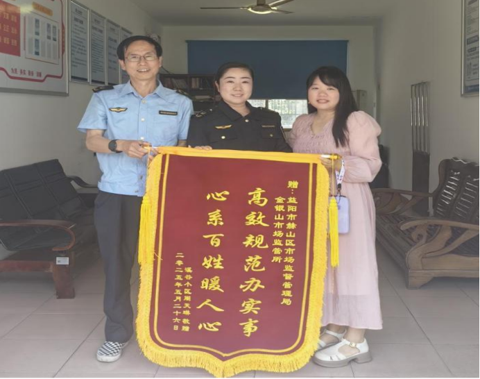 近日,赫山区会龙山溪谷小区居民周女士将一面印有“高效规范办实事,心系百姓暖人心”的锦旗送到赫山区市场监督管理局金银山市场监管所,对该所积极处理小区电梯噪音投诉,切实解决困扰居民生活的难题表达诚挚感谢。