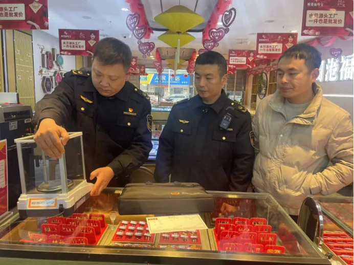 在检查中,执法人员重点检查黄金珠宝饰品是否按国家法定计量单位称重结算,在售产品是否明码标价、标签标注与实际重量是否相符,在用计量器具是否经过强制检定并粘贴检定合格标识,是否存在“四舍五入”反向抹零、“低标高结”价格欺诈行为;仔细查验黄金饰品品牌代理商是否取得授权资质,以及售后服务质量承诺是否履行到位;依法严查篡改计量器具、广告虚假宣传、趁以旧换新之机缺“金”少两、加工黄金饰品掺杂使假等违法行为。