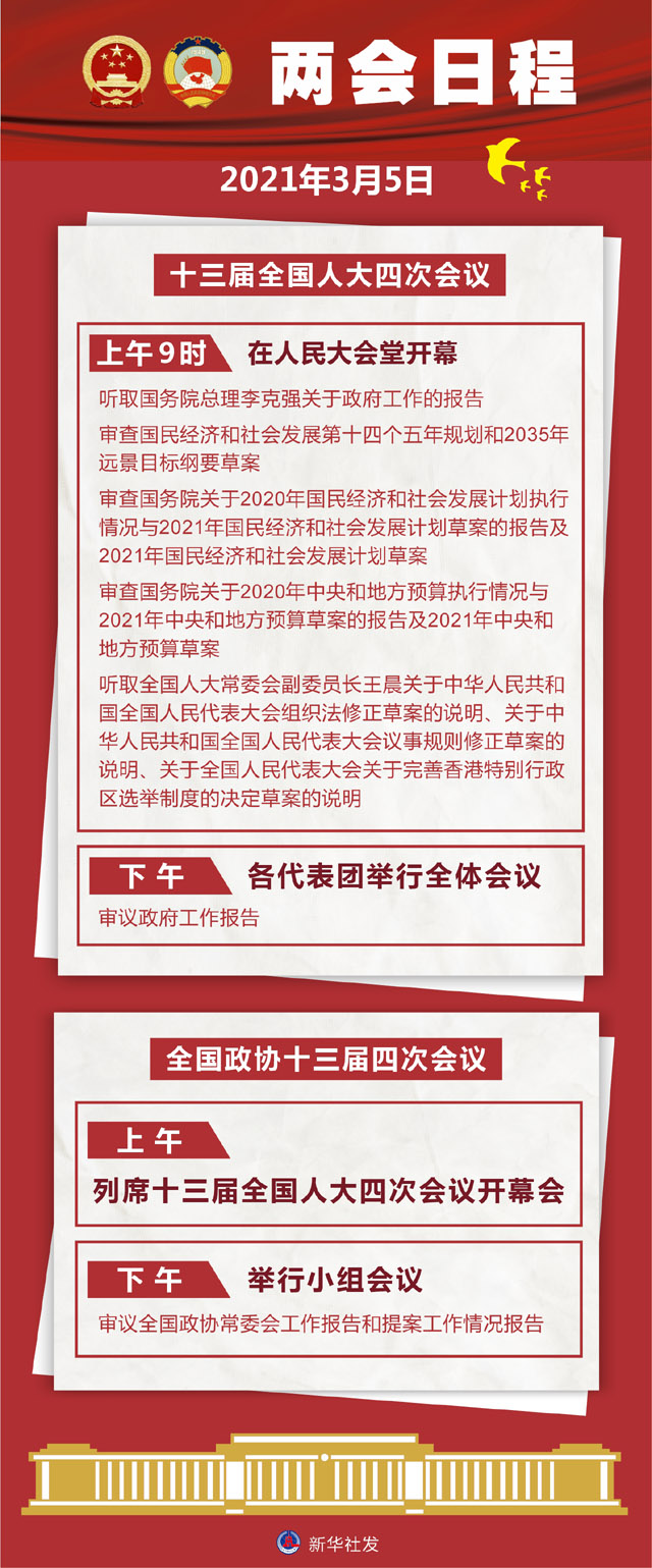 新华社北京3月4日电 十三届全国人大四次会议5日上午9时在人民大会堂开幕,听取国务院总理李克强关于政府工作的报告,审查国民经济和社会发展第十四个五年规划和2035年远景目标纲要草案,审查国务院关于2020年国民经济和社会发展计划执行情况与2021年国民经济和社会发展计划草案的报告及2021年国民经济和社会发展计划草案,审查国务院关于2020年中央和地方预算执行情况与2021年中央和地方预算草案的报告及2021年中央和地方预算草案,听取全国人大常委会副委员长王晨关于中华人民共和国全国人民代表大会组织法修正草案的说明、关于中华人民共和国全国人民代表大会议事规则修正草案的说明、关于全国人民代表大会关于完善香港特别行政区选举制度的决定草案的说明。下午,各代表团举行全体会议,审议政府工作报告。 5日上午,出席全国政协十三届四次会议的全国政协委员列席十三届全国人大四次会议开幕会,听取政府工作报告。5日下午,全国政协十三届四次会议举行小组会议,审议全国政协常委会工作报告和提案工作情况报告。 中央广播电视总台将对十三届全国人大四次会议开幕会进行现场直播,新华网将对开幕会作现场图文直播。 |