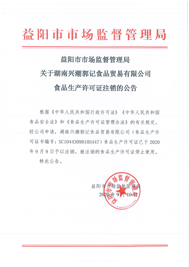 | 关于湖南兴潮郭记食品贸易有限公司食品生产许可证注销的公告 |