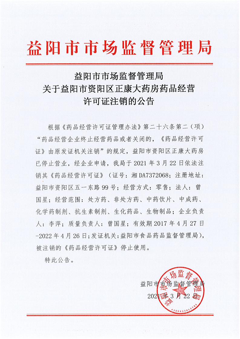 | 零售药店药品经营许可证注销公示(资阳区正康大药房) |