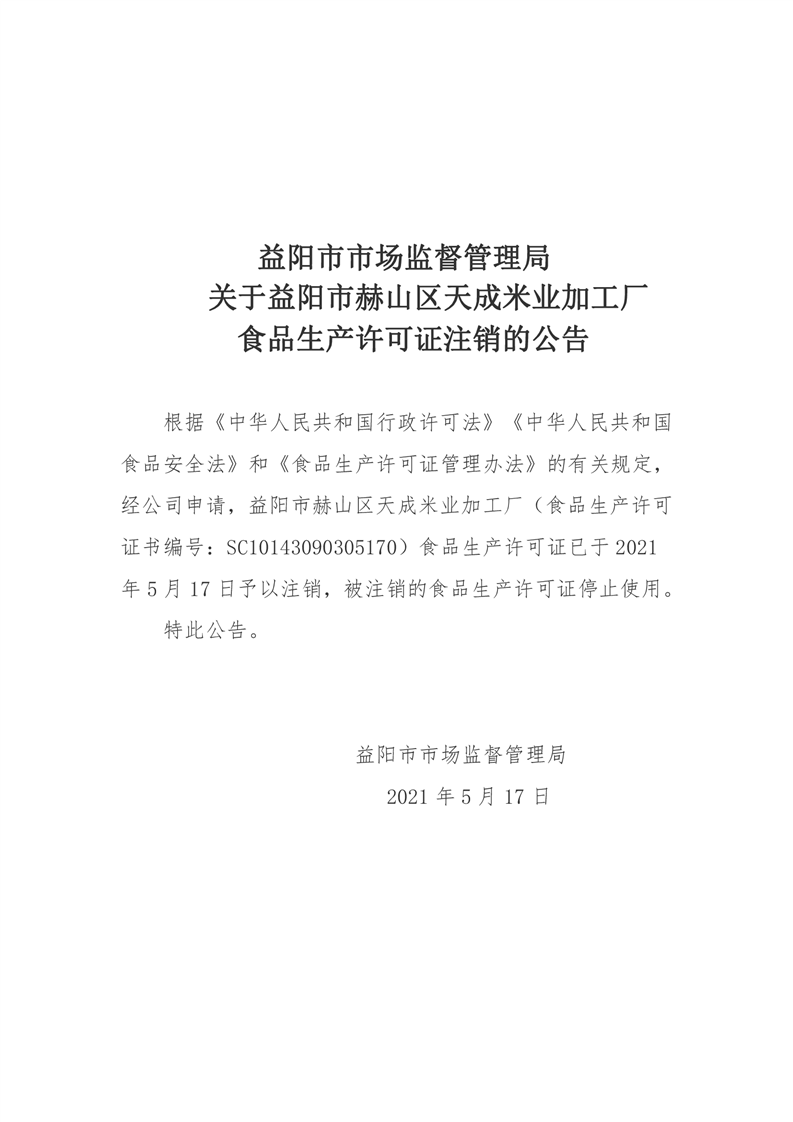 | 益阳市市场监督管理局关于益阳市赫山区天成米业加工厂食品生产许可证注销的公告 |
