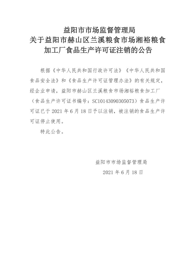 | 益阳市市场监督管理局关于益阳市赫山区兰溪粮食市场湘裕粮食加工厂食品生产许可证注销的公告 |