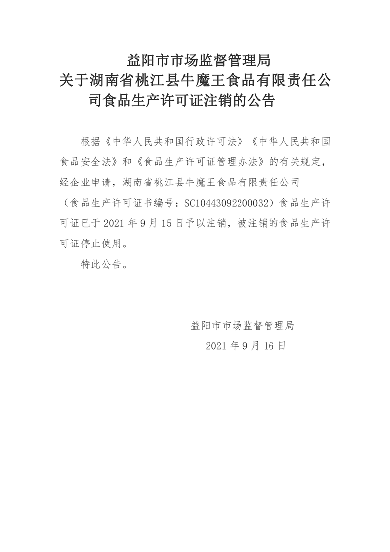 | 关于湖南省桃江县牛魔王食品有限责任公司食品生产许可证注销的公告 |