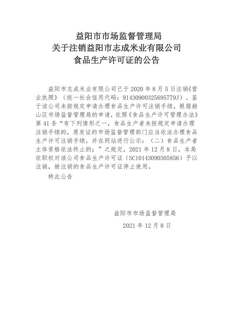 | 关于益阳市志成米业有限公司食品生产许可证注销的公告 |