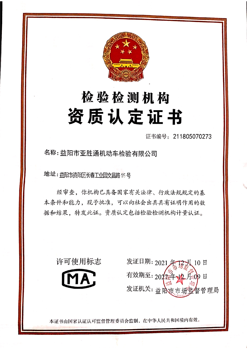 | 检验检测机构资质认定证书(益阳市亚胜通机动车检验有限公司) |