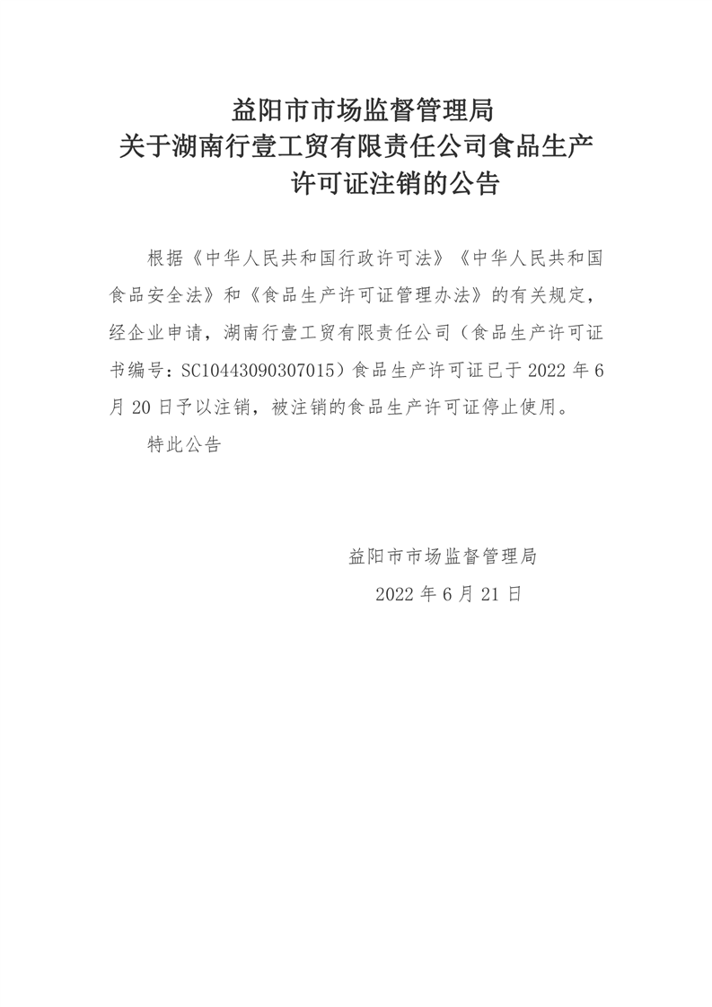| 关于湖南行壹工贸有限责任公司食品生产 许可证注销的公告 |
