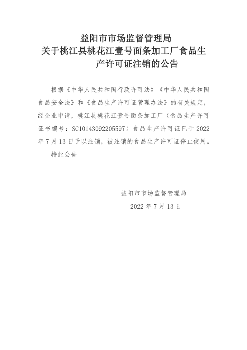 | 关于桃江县桃花江壹号面条加工厂食品生产许可证注销的公告 |