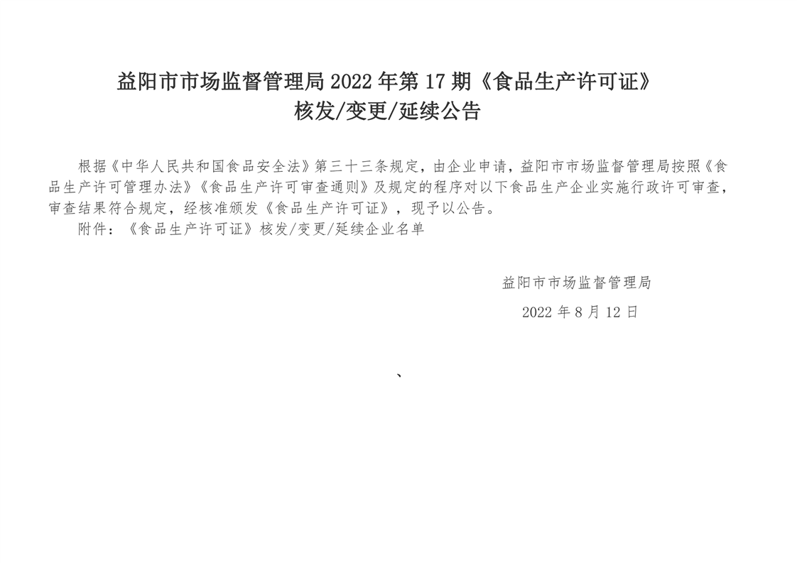 | 2022年第17期《食品生产许可证》核发/变更/延续公告 |