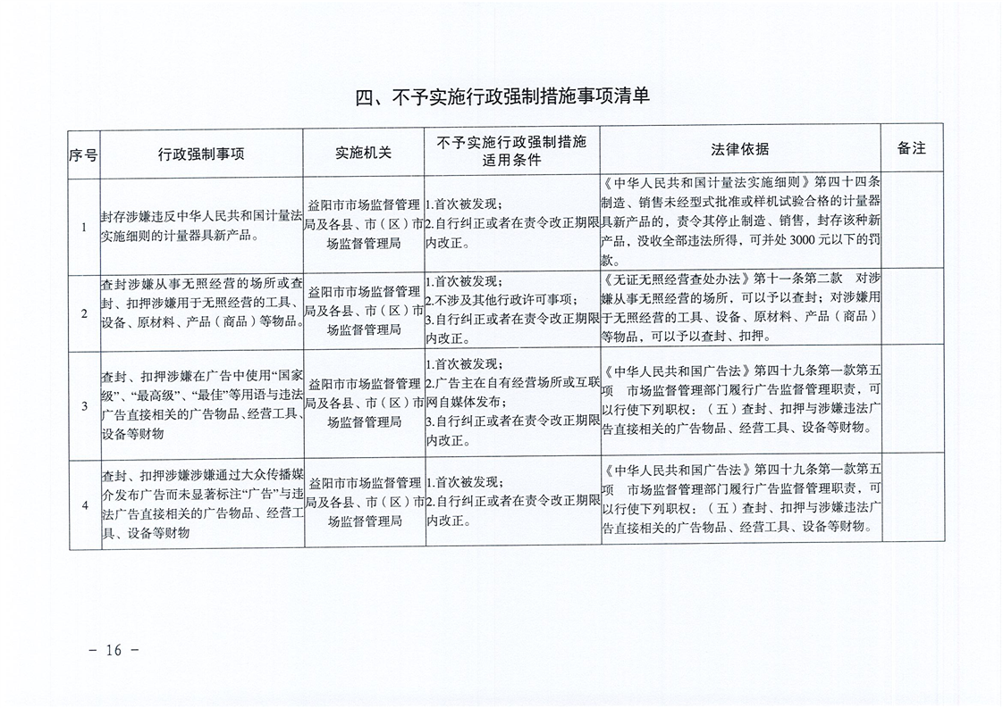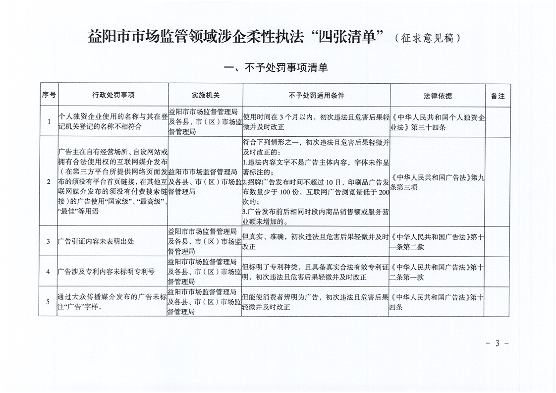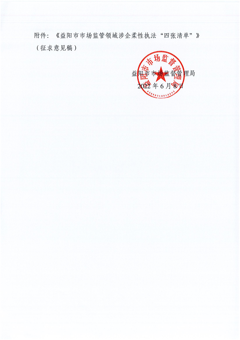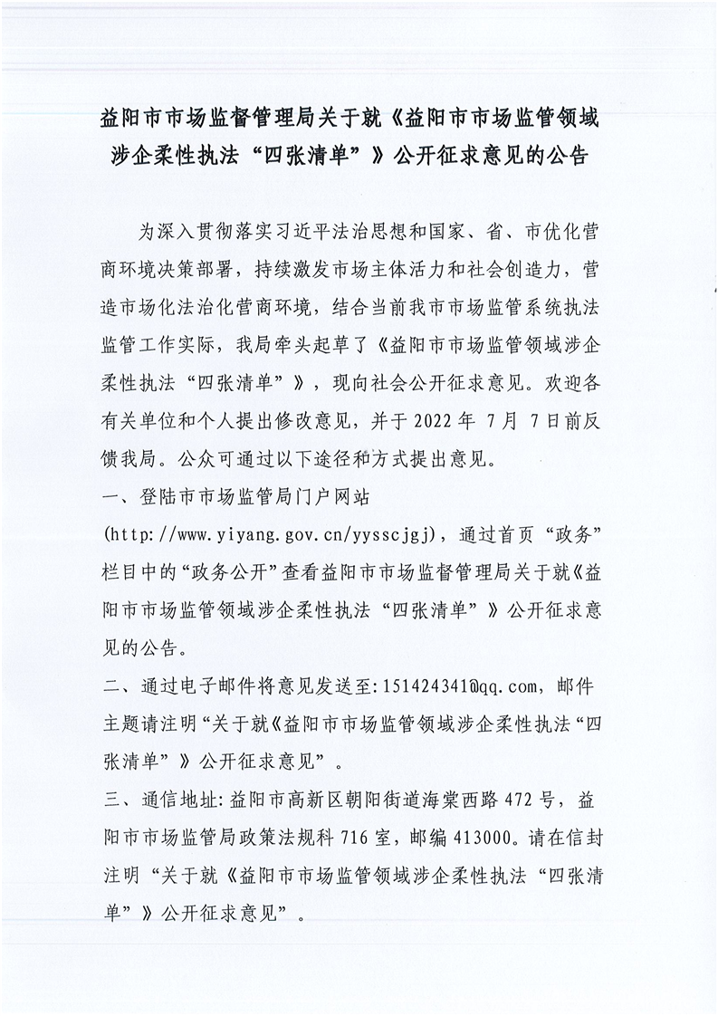 | 关于就《益阳市市场监管领域涉企柔性执法“四张清单”》公开征求意见的公告 |