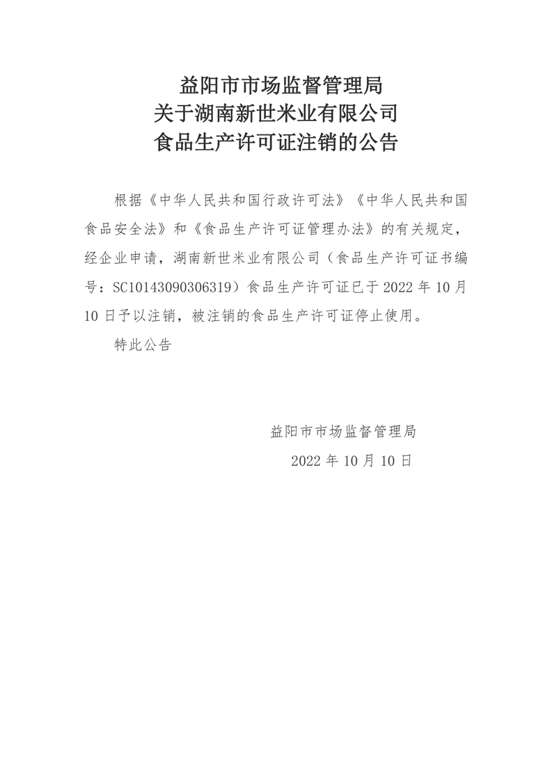| 关于湖南新世米业有限公司食品生产许可证注销的公告 |