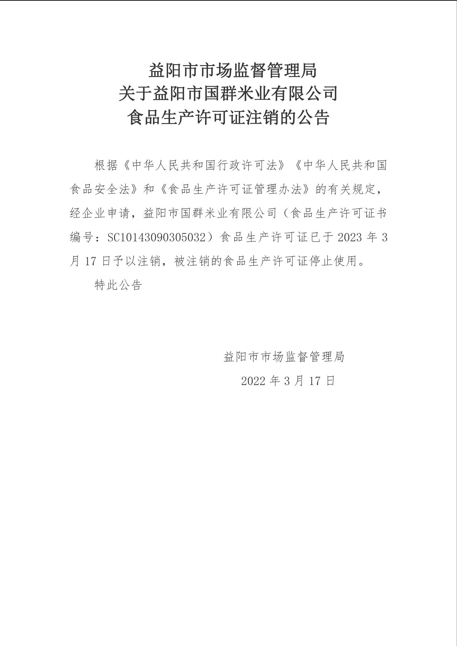 | 关于益阳市国群米业有限公司食品生产许可证注销的公告 |
