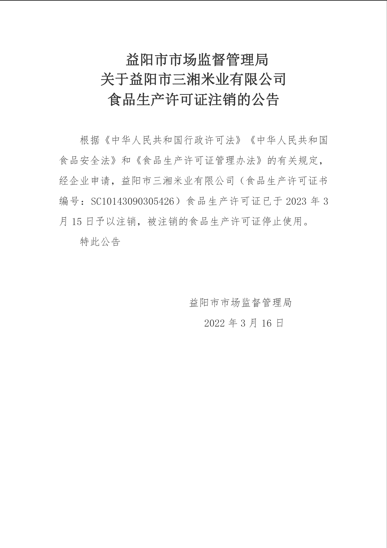 | 关于益阳市三湘米业有限公司食品生产许可证注销的公告 |