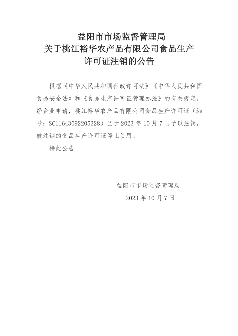 | 关于桃江裕华农产品有限公司食品生产许可证注销的公告 |