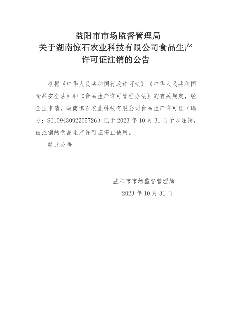 | 关于湖南惊石农业科技有限公司食品生产许可证注销的公告 |