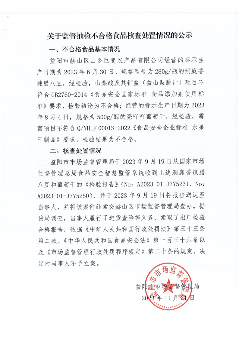 | 关于监督抽检不合格食品核查处置情况的公示(2023年11月21日) |