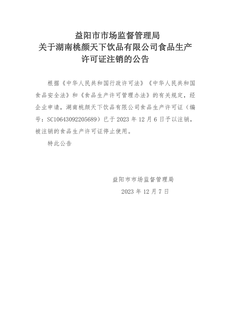 | 关于湖南桃颜天下饮品有限公司食品生产许可证注销的公告 |