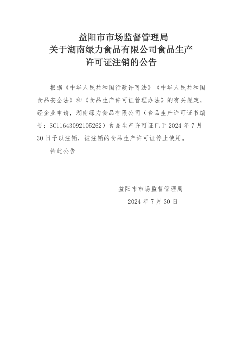 | 关于湖南绿力食品有限公司食品生产许可证注销的公告 |